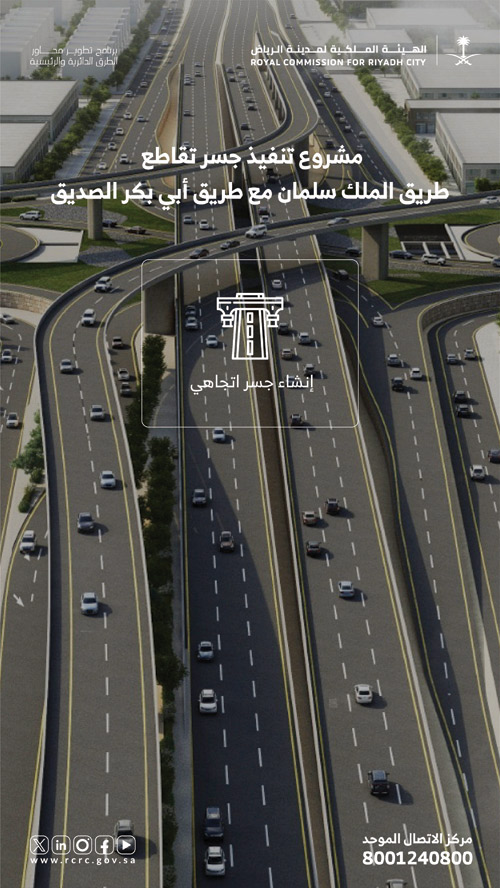 7 - مشروع تنفيذ جسر تقاطع طريق الملك سلمان مع طريق أبي بكر الصديق، ويشمل تنفيذ جسر من طريق الملك سلمان شرقًا إلى طريق أبي بكر الصديق شمالًا، بهدف تعزيز انسيابية حركة المرور ورفع كفاءتها.
