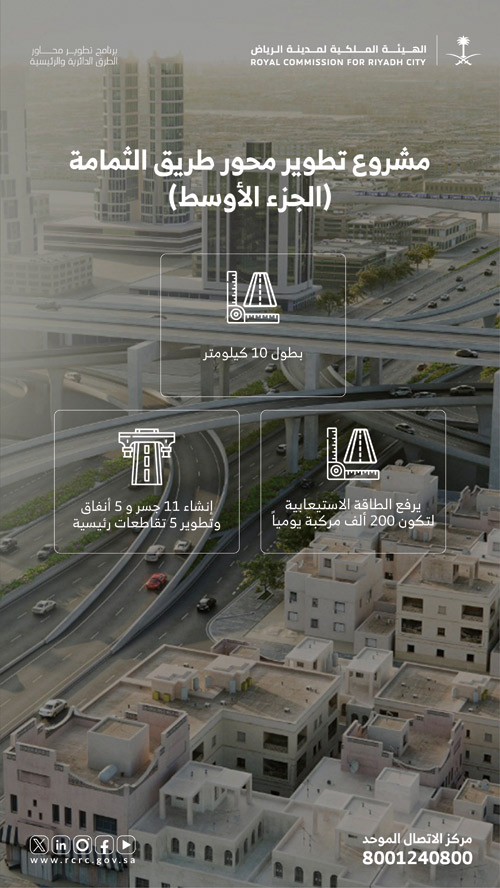 2 - مشروع تطوير محور طريق الثمامة (الجزء الأوسط)، بطول (10 كم)، ويشمل تطوير (5 تقاطعات) رئيسة وإنشاء (11 جسرًا) و (5 أنفاق)، مما يسهم في رفع الطاقة الاستيعابية للطريق إلى (200 ألف مركبة) يوميًا.