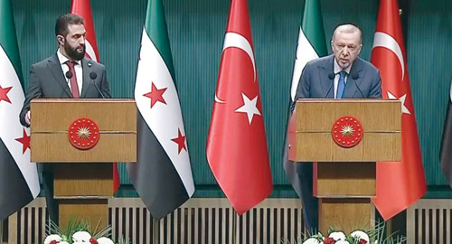 أكد الرئيس التركي رجب طيب أردوغان أمس أن بلاده ستعمل على دعم سوريا ونهضتها، مشددا على وجوب رفع العقوبات الغربية لتحقيق ذلك. وأعلن خلال مؤتمر صحفي مشترك في أنقرة مع الرئيس السوري أحمد الشرع أعلن أن تركيا ستؤسس مع إدارة الشرع لمنطقة خالية من الإرهاب، وأضاف ...