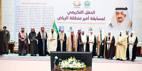 رعى صاحب السمو الملكي الأمير فيصل بن بندر بن عبدالعزيز أمير منطقة الرياض، في قصر الحكم أمس، الحفل الختامي لمسابقة أمير منطقة الرياض لحفظ القرآن الكريم وتلاوته وتفسيره للبنين والبنات في دورتها العاشرة لعام 1446هـ التي تنظمها الجمعية الخيرية لتحفيظ القرآن الكريم بالرياض (مكنون).