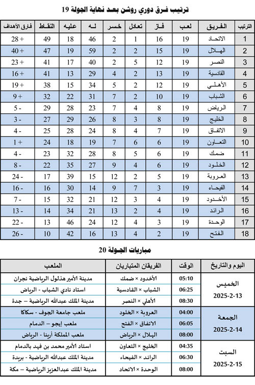 انفرد الاتحاد بصدارة دوري روشن بعد نهاية الجولة 19 إثر فوزه الثمين والشاق على التعاون في الدقيقة الخامسة من الوقت بدل الضائع، فيما فرط الهلال بصدارته بعدما أضاع فوزاً أمام ضمك بسبب الأخطاء الدفاعية وإهدار ضربة جزاء من روبن نيفز، ليخرج الزعيم خاسراً بالتعادل.