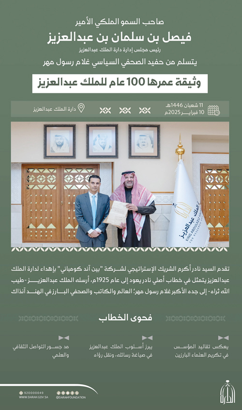 استقبل صاحب السمو الملكي الأمير فيصل بن سلمان بن عبدالعزيز المستشار الخاص لخادم الحرمين الشريفين رئيس مجلس إدارة دارة الملك عبدالعزيز، في مكتبه بالدارة نادر أكرم الشريك الإستراتيجي لشركة «بين آند كومباني»؛ حفيد الصحفي والسياسي الهندي غلام رسول مهر، الذي قدم لسموه وثيقة تاريخية تعود إلى عام 1925، وهي خطاب أصلي وجهه الملك عبدالعزيز -طيب الله ثراه- إلى جده.