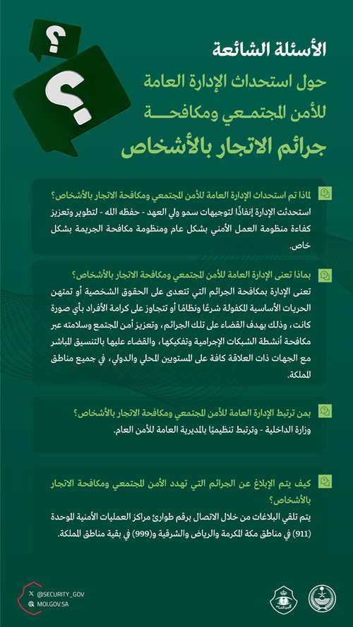 إنفاذا لتوجيهات صاحب السمو الملكي الأمير محمد بن سلمان بن عبدالعزيز آل سعود، ولي العهد رئيس مجلس الوزراء ـ حفظه الله ـ بتطوير وتعزيز كفاءة منظومة العمل الأمني عامة ومنظومة مكافحة الجريمة خاصة، أعلنت وزارة الداخلية عن استحداث الإدارة العامة للأمن المجتمعي ومكافحة جرائم الاتجار بالأشخاص؛ لتعزيز أمن المجتمع وسلامته، وترتبط بالمديرية العامة للأمن العام.