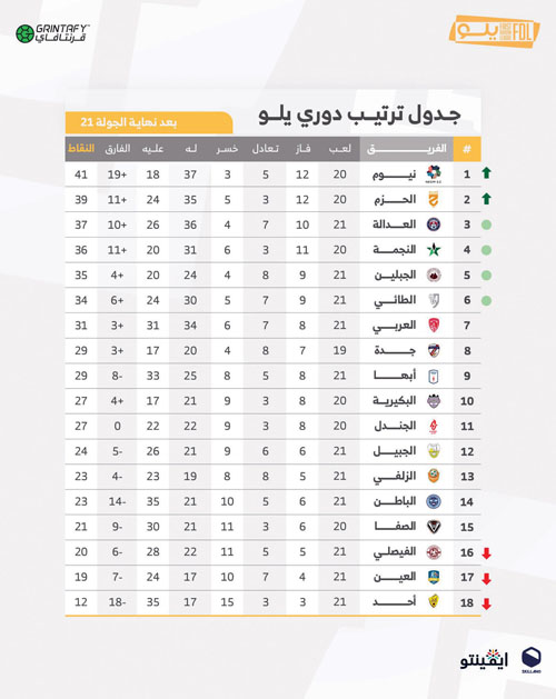 حافظ فريق نيوم على صدارة دوري يلو لأندية الدرجة الأولى للمحترفين بعد أن كسب العين في الباحة 1-0 ليعزز صدارته للدوري برصيد 41 نقطة.