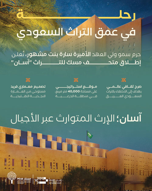 أعلنت حرم سمو ولي العهد، صاحبة السمو الملكي الأميرة سارة بنت مشهور بن عبدالعزيز، إطلاق برامج متحف مسك للتراث «آسان»، المقرر افتتاحه في غضون السنوات القادمة في منطقة الدرعية - إحدى أهم المناطق التراثية في المملكة العربية السعودية -.