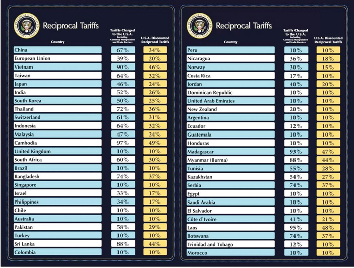 وأكد ترامب في خطابه أمس الأربعاء بحديقة البيت الأبيض أن الرسوم ستشمل فرض نسبة 34% على الصين، و24% على اليابان، و31% على سويسرا، و46% على فيتنام، و32% على تايوان، و26% على الهند، بينما سيفرض الاتحاد الأوروبي رسوماً بنسبة 20%.، وبين أن أقل نسبة للرسوم الجمركية ستكون 10%، والتي ستكون من نصيب بريطانيا وعدد من الدول.