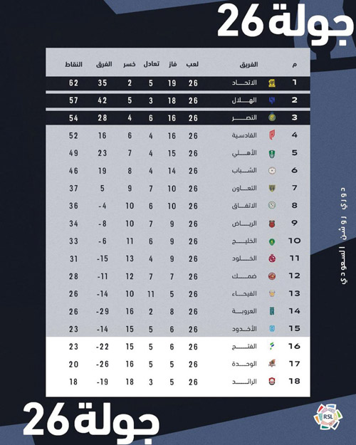 ازداد وضع الرائد حرجاً بعد أن قلب الخليج تأخره أمامه في ملعبه في بريدة إلى فوز مثير ب 2-1 ليثبت الأحمر في ذيل الترتيب بـ18 نقطة فقط، وفي المجمعة تعادل الفيحاء والفتح 1/1 وفي مكة تمكن الشباب من الفوز ب 3-1 على مضيفه الوحدة جاء ذلك في ختام مباريات الجولة الـ26.