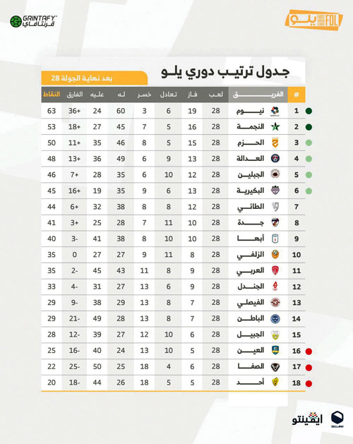 سجل فريق نيوم متصدر دوري يلو أكبر نتيجة في الدوري حتى الآن، بعد فوزه على فريق الباطن بنتيجة 7-2 منها «سوبر هاتريك» للاعب كارلوس جونيور في تبوك، ضمن مباريات الجولة 28 من الدوري، ليرفع الفريق رصيده إلى 63 ويقترب بشكل كبير من الصعود إلى دوري روشن السعودي لأول مرة في تاريخه وبعد خسارته بقي الباطن في المركز الـ14 برصيد 29 نقطة.