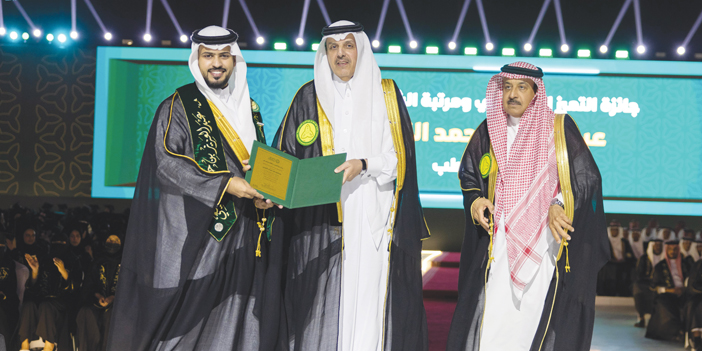 وألقى الخريج عبدالملك الأومير، والخريجة يارا السعيد نيابة عن زملائهم، كلمة الخريجين عبروا فيها عن سعادتهم وزملائهم في يوم تخرجهم الذي يمثل المستقبل المشرق لهم كخريجين يتوقون فيه لخدمة دينهم ومليكهم ووطنهم، شاكرين سموه على رعاية حفل تخريجهم مع شكرهم لأعضاء هيئة التدريس بالجامعة على ما قدموه لهم طيلة سنوات الدراسة بالجامعة.