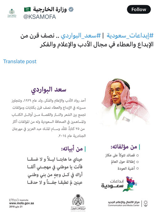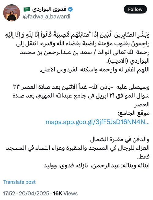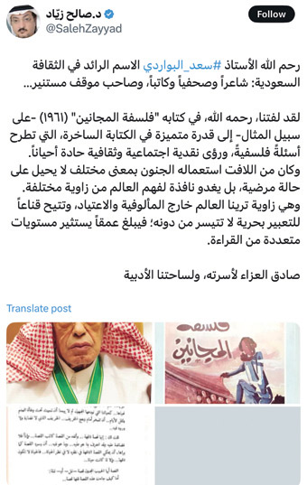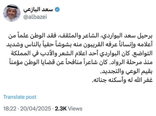 وكتب في منشور له على منصة ( X ) :»رحم الله الأستاذ سعد البواردي، الاسم الرائد في الثقافة السعودية: شاعراً وصحفياً وكاتباً، وصاحب موقف مستنير… لقد لفتنا، -رحمه الله-، في كتابه فلسفة المجانين (1961) - على سبيل المثال - إلى قدرة متميزة في الكتابة الساخرة، التي تطرح أسئلةً فلسفيةً، ورؤى نقدية اجتماعية وثقافية حادة أحياناً».