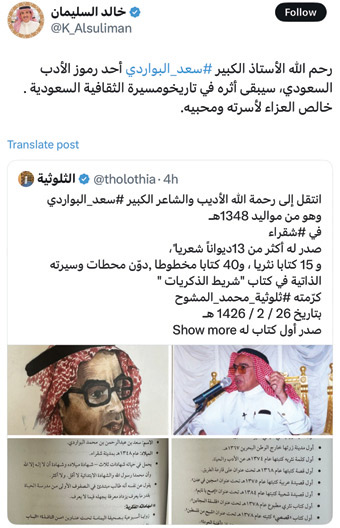 من جانبه عبر الكاتب والإعلامي خالد السليمان عن حزنه لرحيل الأديب والشاعر سعد البواردي، مؤكدًا أن بصمته ستظل حاضرة في تاريخ الثقافة السعودية، وقال السليمان :»رحم الله الأستاذ الكبير سعد البواردي، أحد رموز الأدب السعودي، سيبقى أثره في تاريخ ومسيرة الثقافة السعودية.. خالص العزاء لأسرته ومحبيه.»