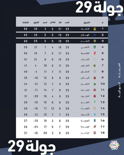 اختتمت الخميس مباريات الجولة الـ29 من الدوري بمباراتين، ففي الأولى تعادل الفيحاء مع العروبة 2-2، وفي الثانية أكد التعاون تفوقه على الرائد حين هزمه بـ4-3 وبقي الرائد في المركز الأخير بـ21 نقطة، والتعاون وصل للنقطة 41.