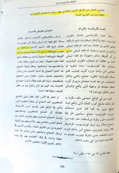 وكان هؤلاء الشيوخ قد أخذوا الحجاج في السنة الماضية بأمن وأمان وأعادوهم غانمين سالمين فنالوا رضى الحجاج وشكرهم ولهذا فإن قيام هؤلاء بأخذ حجاج الأحساء بعد اليوم هو أولى وأنفع لهم من كل الوجوه وعليه فقد أمرت: