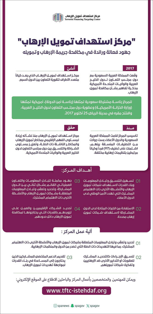 يعد مركز استهداف تمويل الإرهاب الذي أُنشئ بمدينة الرياض في 21 مايو 2017 م، كيانًا متعدد الأطراف لتقوية التعاون بين سبع دول، تضم إلى جانب المملكة العربية السعودية، كلًا من (الإمارات العربية المتحدة، ومملكة البحرين، وسلطنة عمان، ودولة قطر، ودولة الكويت، والولايات المتحدة الأمريكية)، لتعطيل شبكات تمويل الإرهاب والأنشطة ذات الصلة ومحل الاهتمام المشترك.ويهدف المركز إلى تسهيل التنسيق وتبادل المعلومات وبناء القدرات، لاستهداف شبكات تمويل الإرهاب والأنشطة الأخرى ذات الاهتمام المشترك التي تهدد الأمن الوطني لدى الدول الأعضاء، والاستفادة من الخبرات المتاحة لدى الدول المشاركة لاستهداف شبكات تمويل الإرهاب، وكذلك تحديد الشركاء الإقليميين والعمل على تزويدهم بالقدرات التي يحتاجونها لمكافحة تمويل الإرهاب داخل حدودهم.وسعيًا من المملكة العربية السعودية لزيادة مستوى التعاون والتنسيق والفهم المشترك لتعطيل تمويل الإرهاب، أُنشئ «مركز استهداف تمويل الإرهاب» استنادًا إلى مذكرة تفاهم بشأن مكافحة تمويل الإرهاب، وقّعت بين دول مجلس التعاون لدول الخليج العربية والولايات المتحدة الأمريكية، وقادت إلى اتخاذ مزيد من الإجراءات في هذا الشأن وفقًا لمبدأ المنفعة المشتركة.