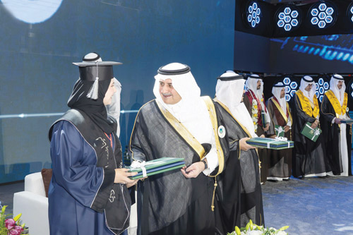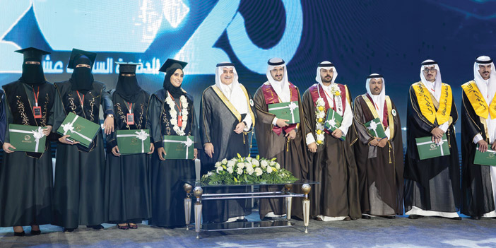 وفي ختام الحفل، سلم سمو أمير منطقة تبوك وثائق التخرج لممثلي الأقسام من الخريجين والخريجات الأوائل، والتقطت الصور التذكارية مع الخريجين.