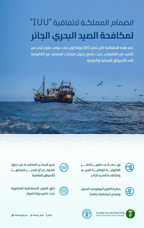 أعلنت وزارة البيئة والمياه والزراعة عن انضمام المملكة العربية السعودية إلى اتفاقية منظمة الأغذية والزراعة للأمم المتحدة «الفاو»، بشأن التدابير التي تتخذها دولة الميناء لمنع الصيد البحري الجائر وغير المبلّغ عنه وغير المنظّم، بالإضافة إلى العمل على ردعه والقضاء عليه؛ لتُسهم في تعزيز جهود المملكة في حماية التنوع البيولوجي البحري وتحقيق الاستدامة البيئية على مستوى العالم.