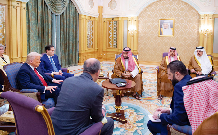 بدعوة كريمة من صاحب السمو الملكي الأمير محمد بن سلمان بن عبدالعزيز آل سعود ولي العهد رئيس مجلس الوزراء، تم عقد لقاء في (الرياض) صباح أمس الأربعاء (16 / 11 / 1446 هـ) الموافق (14 / 5 / 2025 م) بين سموه الكريم وفخامة رئيس الولايات المتحدة الأمريكية السيد / دونالد جي ترمب، وفخامة رئيس الجمهورية التركية السيد/ رجب طيب أردوغان (مشاركًا عبر اتصال هاتفي) وفخامة رئيس الجمهورية العربية السورية السيد / أحمد الشرع، وتم تناول مستقبل الأوضاع في سوريا، وتأكيد أهمية استقرارها وسيادتها ووحدة أراضيها، وتحقيق الأمن والرخاء للشعب السوري، وكذلك بحث الأوضاع الإقليمية وأهمية العمل على إيجاد الحلول المناسبة لها.