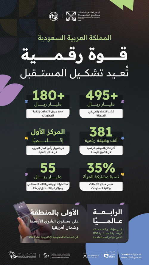 حققت المملكة قفزات نوعية في مجالات الاقتصاد الرقمي، والذكاء الاصطناعي، ومراكز البيانات، والحكومة الرقمية، وتنمية القدرات البشرية، ضمن مستهدفات رؤية المملكة 2030، التي أرست دعائم التحول إلى اقتصاد معرفي يقوده الابتكار، ويستثمر في الإنسان والتقنية؛ مما يؤكد مكانتها المتقدمة بوصفها قوة رقمية إقليمية وعالمية.وفي الوقت الذي تحتفل فيه دول العالم باليوم العالمي للاتصالات ومجتمع المعلومات، تبرز المملكة بصفتها أكبر اقتصاد رقمي في منطقة الشرق الأوسط وشمال أفريقيا، بقيمة تتجاوز (495) مليار ريال، تمثل (15%) من الناتج المحلي الإجمالي؛ مما يعكس تحولًا جذريًّا في بنية الاقتصاد الوطني، ونجاح المملكة في تنويع مصادر الدخل من خلال تسريع وتيرة الاقتصاد الذكي.