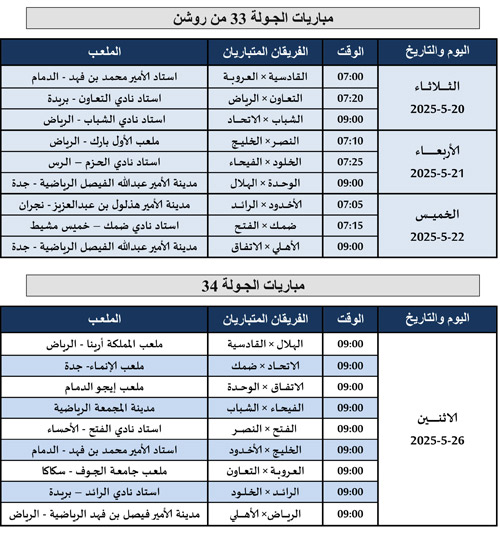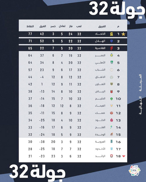 اختتمت أمس الجولة الـ32 من الدوري بثلاث مباريات، ففي الدمام تعادل الاتفاق وضمك سلبياً بدون أهداف ليرتفع رصيد ضمك لـ35 نقطة ربما أمنت موقعه في البقاء، وفي المجمعة فاز الفيحاء على الأخدود 2-0 ليؤمن موقعه حين رفع رصيده لـ 36 نقطة وبقي الأخدود بـ28 نقطة، وفي جدة نجح الأهلي في الانتصار على الخلود بـ(4-1) ليرتفع رصيده لـ64 نقطة متساوياً مع النصر ومتخلفاً عن القادسية بنقطة الذي يحتل المركز الثالث.