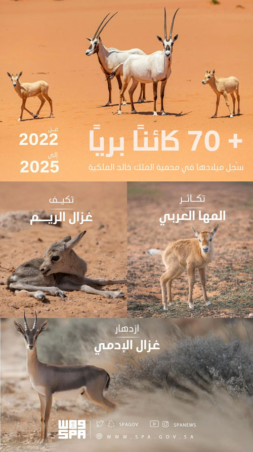 وبحسب ما رُصِد حتى منتصف الربع الثاني من عام 2025م، فقد وُلد 17 غزالًا من الريم، و6 من المها العربي، في مؤشر يعكس فاعلية البرامج الميدانية التي تنفذها الهيئة للحفاظ على التوازن البيئي، وتعزيز التنوع الأحيائي.