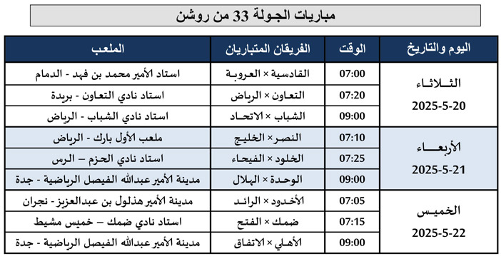 تنطلق مساء اليوم الثلاثاء مواجهات الجولة الثالثة والثلاثين من دوري روشن للمحترفين، وستحفل هذه الجولة بإثارة كبيرة نظير الصراع الكبير في مؤخرة الترتيب ورغبة الفرق الستة في الهروب من صراع الهبوط واللحاق بالبقاء قبل نهاية الدوري بجولة، وستكون المواجهات على النحو التالي: