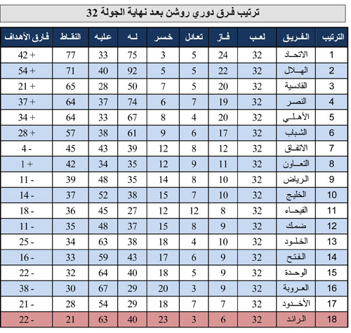 الفريق القدساوي قفز للمركز الثالث في الجولة الماضية بفوزه على الوحدة 3/1 ورفع رصيد إلى 65 نقطة ويأمل في تعثر منافسيه النصر والأهلي لضمن المركز الثالث والتفرغ لنهائي كأس الملك الذي سيواجه فيه الاتحاد، فيما سيلعب العروبة بشعار أكون أو لا أكون لتعويض خسارته أمام الخليج 1/2 التي قربته من الهبوط رسمياً بتوقف رصيده على 30 نقطة في المركز السادس عشر.