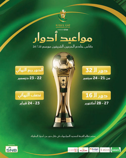 كما حدد الفترة من 21، وحتى 24 سبتمبر 2025 موعدا لإقامة مباريات دور الـ32 من كأس خادم الحرمين الشريفين، ويومي 27 و28 أكتوبر موعدا لإقامة مباريات الدور ثمن النهائي، ويومي 22 و23 ديسمبر لمباريات ربع النهائي، ويومي 23و24 فبراير 2026 لمباراتي نصف النهائي.