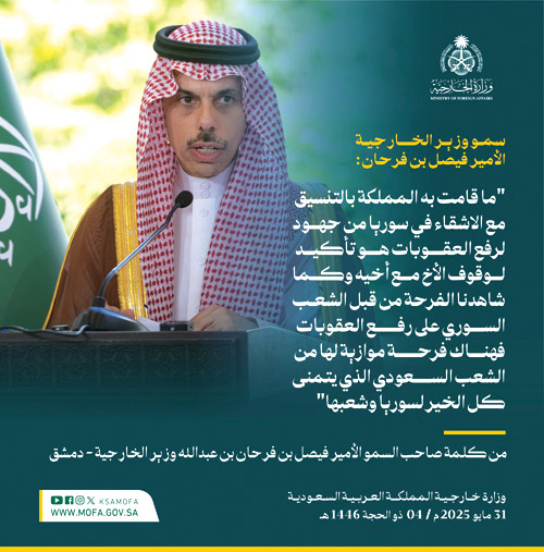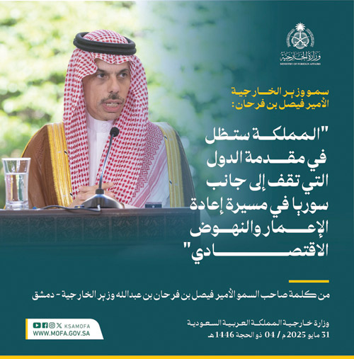 وأكد وزير الخارجية أن سمو ولي العهد وجه بتقديم كافة أشكال الدعم والإسناد لسوريا، مبيناً أن السوريين أمامهم فرصة لبناء وطنهم، والسعودية ستدعمهم في تحقيق ذلك.