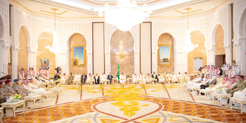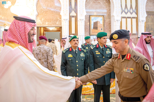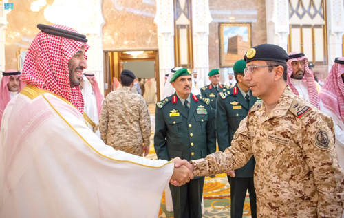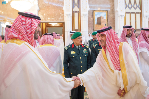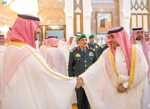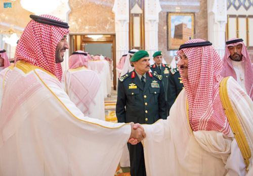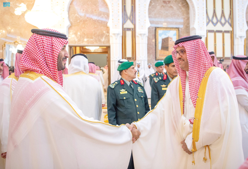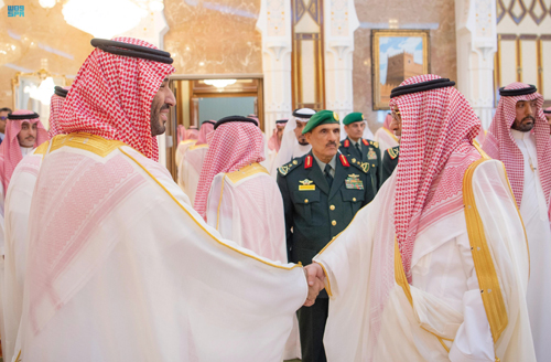 نيابة عن خادم الحرمين الشريفين الملك سلمان بن عبدالعزيز آل سعود القائد الأعلى لكافة القوات العسكرية ـ حفظه الله ـ استقبل صاحب السمو الملكي الأمير محمد بن سلمان بن عبدالعزيز آل سعود ولي العهد رئيس مجلس الوزراء، في الديوان الملكي بقصر منى، أمس، المهنئين بعيد الأضحى المبارك، وهم: دولة السيد محمد شهباز شريف رئيس الوزراء في جمهورية باكستان الإسلامية، وأصحاب السمو الملكي الأمراء، وسماحة مفتي عام المملكة، وأصحاب الفضيلة العلماء والمشايخ، وكبار المدعوين من دول مجلس التعاون لدول الخليج العربية، وأصحاب المعالي الوزراء، وقادة القطاعات العسكرية المشاركة في حج هذا العام، وقادة الأسرة الكشفية في المملكة المشاركة في الحج.وبدئ حفل الاستقبال بتلاوة آيات بينات من القرآن الكريم.
