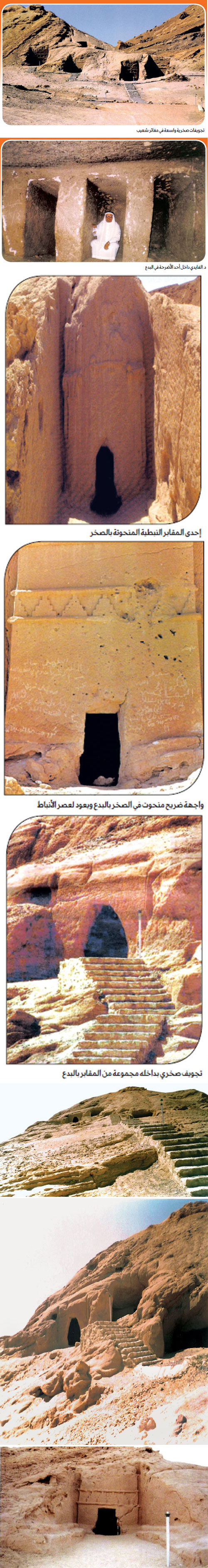 المجموعة الأولى: تتصف مقابر ومدافن هذه المجموعة عن المجموعات الأخرى بأنها لم تنحت في غرف ذات وجهة، بل أنها نحتت بالعراء على سفوح الأودية وعلى الجبال. المجموعة الثانية: وهي المدافن ذات الواجهات غير المزخرفة وقد وجد داخل غرف الدفن تنوعاً في عناصرها المعمارية وطريقة نحت قبورها.