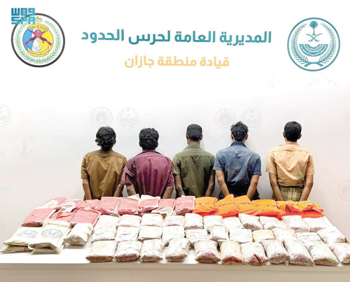 في إطار تنفيذ مهام وزارة الداخلية في مكافحة المخدرات وجهودها في متابعة نشاطات تهريبها وترويجها التي تستهدف أمن المملكة وشبابها، أحبطت المديرية العامة لحرس الحدود محاولات تهريب (2,756,806) أقراص من مادة الإمفيتامين المخدر و(1,944,230) قرصًا خاضعًا لتنظيم التداول الطبي و(4) أطنان من مادة الحشيش المخدر و(180) طنًا من نبات القات المخدر، وقبضت على مهربيها بمناطق تبوك وجازان وعسير ونجران ومكة المكرمة والمدينة المنورة والمنطقة الشرقية، وهم (1518) مخالفًا لنظام أمن الحدود من الجنسية الإثيوبية و(842) مخالفًا لنظام أمن الحدود من الجنسية اليمنية و(7) مخالفين لنظام أمن الحدود من الجنسية السودانية و(6) مخالفين لنظام أمن الحدود من الجنسية الإرترية و(3) مخالفين لنظام أمن الحدود من الجنسية الصومالية ومخالفان لنظام أمن الحدود من الجنسية الباكستانية و(33) مواطنًا.