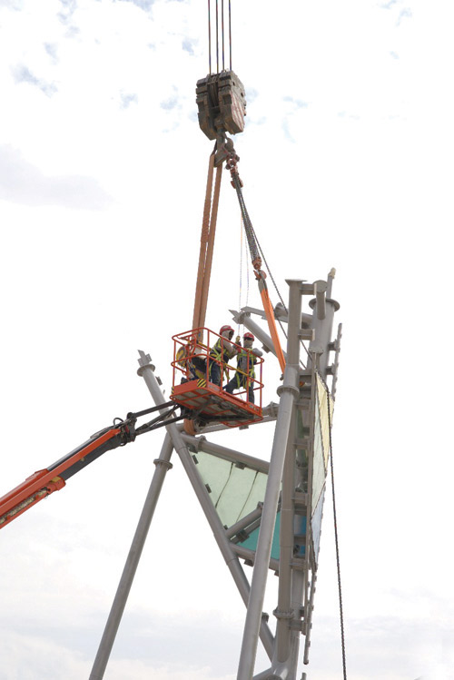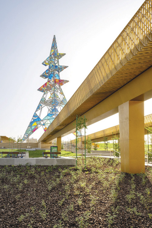وفي هذا المشروع نجد أن الهندسة تتناغم مع الطبيعة حيث يبلغ ارتفاع البرج 83.5 مترًا، ويحتوي على 691 لوحة ملوّنة تشكّل واجهته النابضة بالحياة. وقد تم تصميمه ليكون متناغمًا مع البيئة المحيطة؛ إذ كانت الرياح شريكًا أساسيًا في تشكيله. يروي غارم أن تصميم البرج لم يكن قرارًا هندسيًا فحسب، بل كان حوارًا مع الطبيعة، مع الهواء، مع الحياة، ومع حدود الإنسان.