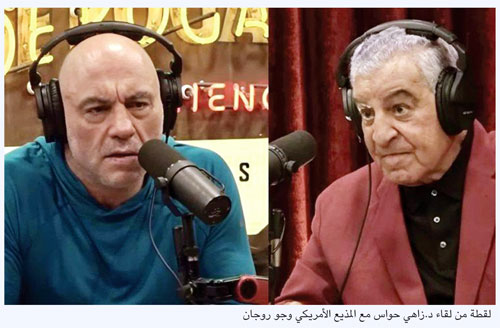 - كلُّه مهم! كانت تلك المواجهة غير المتكافئة مع المهرِّج الأميركي المعروف (جو روجان Joe Rogan)، ذات دلالات حضاريَّة. ولا تجنِّي في وصف جو بالمهرِّج، فهو كذلك بالفعل، شكلًا ومضمونًا، يذكِّرك بأبطال المصارعة الحُرَّة من المهرِّجين خلال القرن الماضي. لقد ظلَّ روجان هذا طوال الوقت مُصِرًّا على أن يسلِّم معه الآثاريُّ المِصْريُّ (زاهي حوَّاس) بخزعبلات غَرَبيَّة حديثة، حول بناء الأهرامات. مكرِّرًا أنَّ ثمَّة إيطاليَّين ما، لله دَرُّهما- ويكفي أنهما أوربيَّان ليُحكَم لهما بالعدالة والعِلميَّة، شاء من شاء وأبى من أبى- زَعَما أنَّ الأهرامات مبنيَّة على أعمدةٍ ضوئيَّة، بدعوَى أنها التُقِطت صُوَر لتلك الأعمدة الوهميَّة عبر الأقمار الاصطناعيَّة!