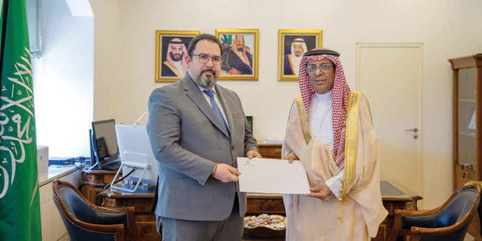 تسلم الرسالة، وكيل وزارة الخارجية للشؤون الدولية المتعددة المشرف العام على وكالة الوزارة لشؤون الدبلوماسية العامة الدكتور عبدالرحمن بن إبراهيم الرسي، خلال استقباله في مقر الوزارة بالرياض أمس، سفير جمهورية فنزويلا البوليفارية لدى المملكة دايفيد بيلاسكيس كارابايو.