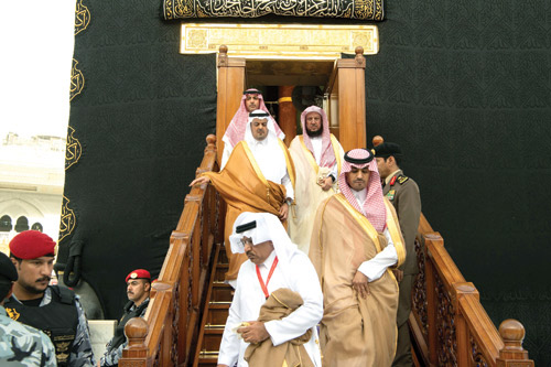 وفور وصول سموّه قام بغسل الكعبة المشرفة من الداخل بماء زمزم المخلوط بماء الورد، وذلك بتدليك جدار الكعبة المشرفة من الداخل بقطع القماش المبللة بالمخلوط، الذي يُحضّر منذ وقت مبكر من قبل الهيئة العامة للعناية بشؤون المسجد الحرام والمسجد النبوي.