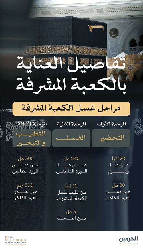 وأكّدت الهيئة العامة للعناية بشؤون المسجد الحرام والمسجد النبوي أن مراحل غسل الكعبة المشرفة تُنفذ بعناية ودقة عالية تعكس مكانة الكعبة المشرفة وبما يليق بقدسيتها ومكانتها الراسخة في قلوب المسلمين.