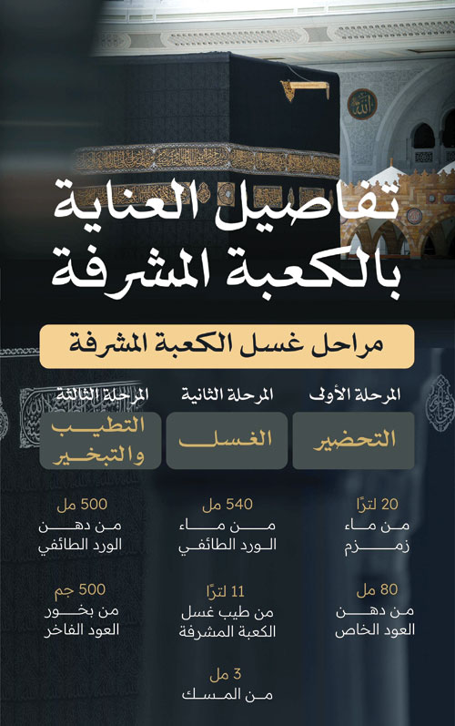 تتضمّن مراحل غسل الكعبة المشرفة ثلاث خطوات رئيسية تتميز تفاصيلها بالعناية المتقنة والدقة الفائقة التي تجسد شرف الزمان والمكان، تبدأ بالتحضير باستخدام (20) لترًا من ماء زمزم، و(80) مل من دهن العود الخاص، إضافة إلى (540) مل من ماء الورد الطائفي.