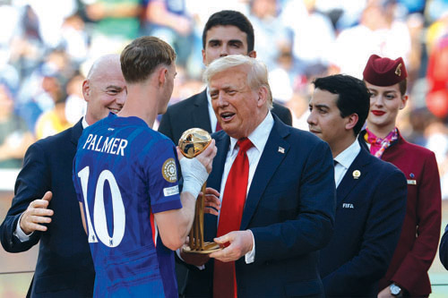 كسر الرئيس الأمريكي رونالد ترامب بروتوكول « فيفا » الذي يقتضي أن يحتفل الفريق الفائز ببطولاته دون مشاركة من يوجد ضمن احتفاء الفريق، وعلى رغم محاولات رئيس (فيفا) جياني إيفانتينو (الخجولة) تلميحاً ثم حديثاً بحشمة مع ترامب لإبعاده عن الاحتفاء مع فريق تشيلسي الفائز بكأس العالم يوم أول أمس، إلا أن الرئيس المثير أصر على الاحتفال مع الفريق الأزرق ووسط لاعبيه خلال تتويجه بالكأس.