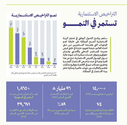 وقد شهدت التراخيص الاستثمارية نموا متسارعا خلال السنوات الأخيرة، مدفوعة بتطوير الأنظمة وإطلاق مبادرات جديدة تدعم المستثمرين، إلى جانب توقيع عشرات الاتفاقيات ومذكرات التفاهم الاستثمارية التي فتحت آفاقا واسعة أمام الشركات العالمية والمحلية لتعزيز أعمالها داخل المملكة.