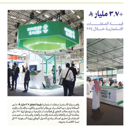 وتجاوزت قيمة الصفقات الاستثمارية التي وقعتها وزارة الاستثمار مع شركات عالمية في عدة دول3.7 مليارات ريال في عام 2024 ، وشملت مجالات التعاون عدة قطاعات استراتيجية استهدفتها رؤية 2030 كمعالجة المياه، والثقافة، والصناعة والإنشاء والعقار والصيانة، بما يساهم في تحقيق أهداف برنامج التحول الوطني ورؤية السعودية 2030 في تنمية الاقتصاد وتنويعه.