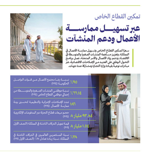 فقد سجلت نسبة رضا مجتمع الأعمال عن قنوات التواصل 95 % في 2024 ، فيما بلغت نسبة موظفي المنشآت الصغيرة والمتوسطة من إجمالي موظفي القطاع الخاص 66.14 %، ووصل عدد الإصلاحات الإجرائية والتنظيمية لتحسين بيئة ممارسة الأعمال إلى 186، كما بلغ حجم مبيعات قطاع التجزئة عبر المدفوعات الإلكترونية 93.84 مليار ريال في 2024، وسجلت قيمة تمويل الشركات الناشئة في المملكة 1.54 مليار ريال في النصف الأول لـ 2024.