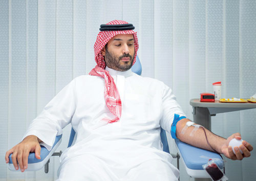 في بادرة إنسانية كريمة، تبرع صاحب السمو الملكي الأمير محمد بن سلمان بن عبدالعزيز آل سعود، ولي العهد رئيس مجلس الوزراء -حفظه الله- بالدم، وذلك ضمن حملة سنوية للتبرع بالدم أطلقها سموه، امتدادًا لرعايته الكريمة للعمل الإنساني، وتشجيعًا لجميع فئات المجتمع على المبادرة بالتبرع، امتثالًا لقوله تعالى: {ومن أحياها فكأنما أحيا الناس جميعًا}، وتجسيدًا لحرصه على تعزيز المشاركة المجتمعية، وترسيخ ثقافة التبرع الطوعي، ودعم الجهود الوطنية في القطاع الصحي، وصولًا إلى رفع نسبة التبرع الطوعي إلى 100% من إجمالي المتبرعين، تحقيقاً لمستهدفات رؤية المملكة 2030 نحو مجتمع حيوي يتمتع بحياة صحية متكاملة.