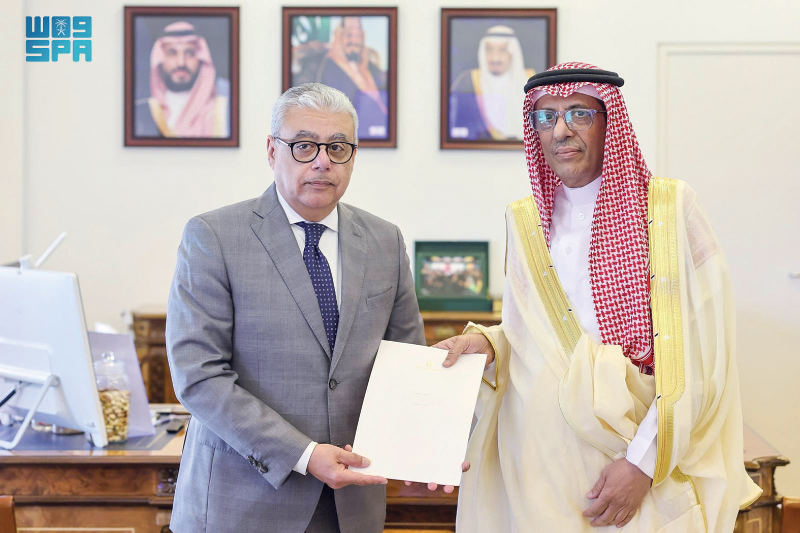 تسلم الرسالة وكيل وزارة الخارجية للشؤون الدولية المتعددة المشرف العام على وكالة الوزارة لشؤون الدبلوماسية العامة الدكتور عبدالرحمن بن إبراهيم الرسي، خلال استقباله في مقر الوزارة بالرياض أمس سفير جمهورية مصر العربية لدى المملكة إيهاب أبو سريع.