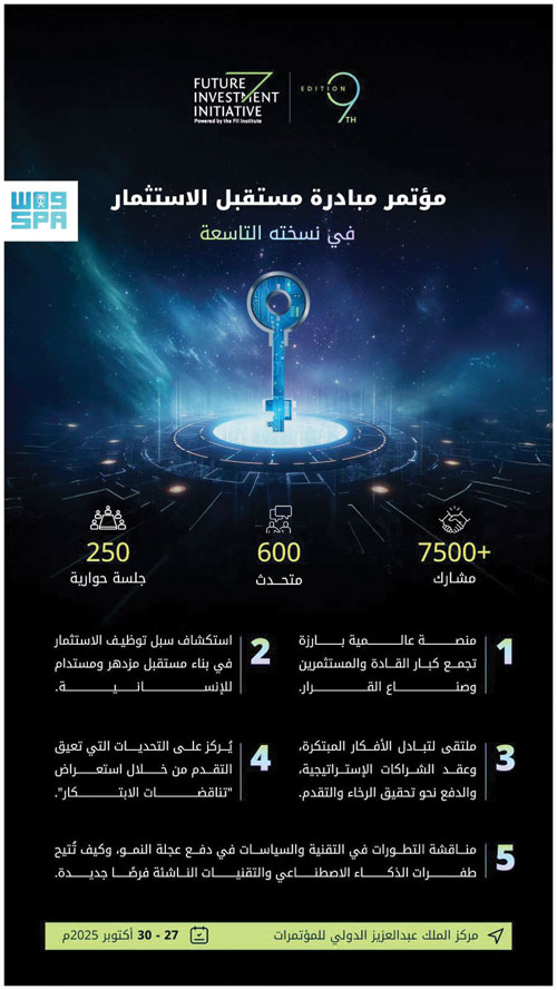 تحت رعاية خادم الحرمين الشريفين الملك سلمان ابن عبدالعزيز آل سعود -حفظه الله-، تستضيف مدينة الرياض، خلال الفترة من 27 إلى 30 أكتوبر 2025م، مؤتمر مبادرة مستقبل الاستثمار في نسخته التاسعة، بمركز الملك عبدالعزيز الدولي للمؤتمرات، تحت شعار «مفتاح الازدهار».