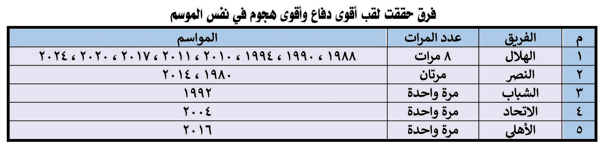 وسجل الهلال والاتحاد رقمين قياسيين في الأفضلية الدفاعية والهجومية، فتصدر الهلال أفضل الفرق دفاعياً لمدة 6 مواسم متتالية، فيما تصدر الاتحاد الفرق الأقوى هجوماً لمدة 6 مواسم متتالية.