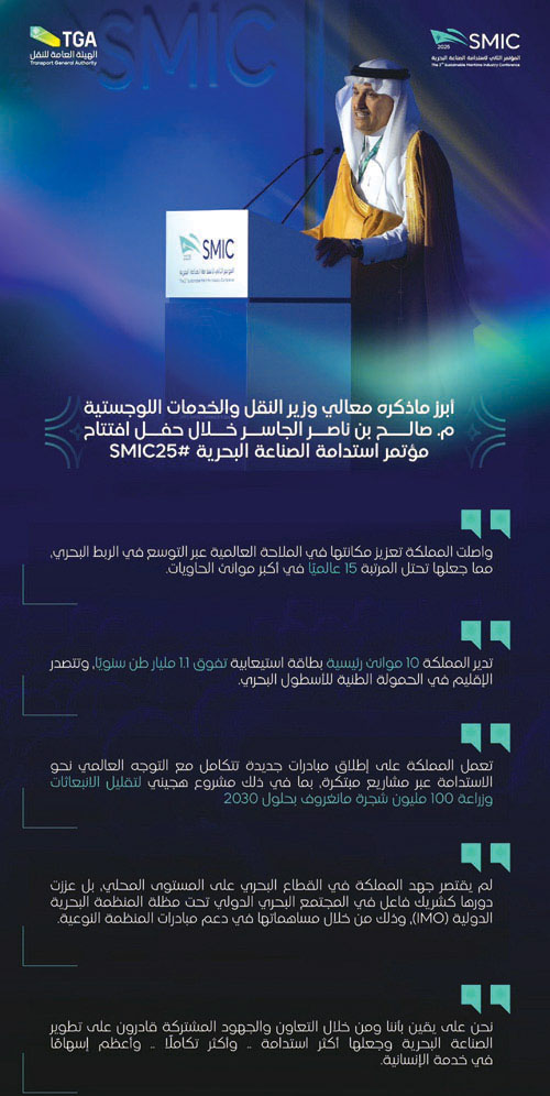 وأشار معاليه إلى أن المملكة تسعى من خلال مبادراتها ومشاريعها النوعية إلى بناء منظومة بحرية متكاملة، توازن بين متطلبات النمو الاقتصادي والمحافظة على البيئة البحرية، وتعمل على تطوير الكفاءات الوطنية وتمكينها من قيادة مستقبل هذا القطاع الحيوي.