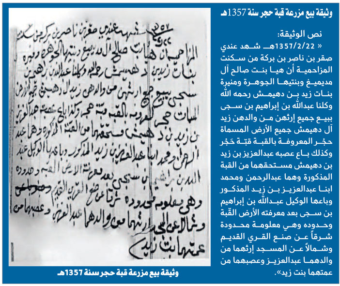 مزرعة قبة حَجْر تكتسب أهميتها بسبب أنها بقيت تحمل هذا الاسم القديم لمدينة الرياض حتى وقت قريب، وهي ضمن مجموعة المزارع التي كانت تقع في الجهة الشمالية الشرقية من الرياض القديمة، وتقع خارج السور على ضفة وادي البطحاء الغربية، إلى الشمال من مزرعة (نخل) الحسي الذي ملكه الإمام عبدالرحمن بن فيصل رحمه الله (انظر الشكل (1))، وموقعها يحده حالياً من جهة الجنوب امتداد شارع الإمام تركي بن عبدالله بن محمد، ومساحة الشارع تدخل ضمن مزرعة قبة حجر، ومن جهتي الشرق والغرب تمتد بين شارع البطحاء شرقاً وشارع الملك فيصل (الوزير) غرباً، أما من جهة الشمال فيحدها المزرعة المعروفة بمزرعة حجر (انظر الشكل (2)، وكانت هذه المزرعة في ملك أسرة آل دهيمش وهي من الأسر القديمة في مدينة الرياض، (انظر كتاب ماضي وتاريخ أسرة آل دهيمش، ص 30-31؛ وصحيفة الجزيرة مقابلة مع عبدالرحمن بن دهيمش، العدد، 6854، الجمعة 23-12-1411هـ، 1991م). ويوجد وثيقة تعود إلى سنة 1357هـ محفوظة في سجلات المحكمة الكبرى في الرياض، تذكر مزرعة قبة حجر، وتثبت أن هذه الاسم بقي مستخدماً إلى ذلك التاريخ (انظر صورة الوثيقة).