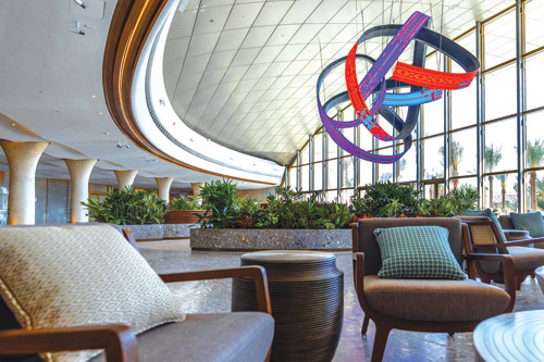 أما المنحوتة الثانية، فجاءت على هيئة «سيمفونية زجاجية» تتألف من أربع قطع زجاجية موزعة على صالات المطار؛ لتجسد جمال الشعب المرجانية والأعشاب البحرية التي يحتضنها البحر الأحمر, وتتلاعب المنحوتات بألوان زاهية وتقنيات دقيقة تعكس التنوع البيئي، وتذكّر بأهمية حماية كنوز المحيطات، في تزامن مع المبادرة التي أطلقتها «البحر الأحمر الدولية» العام الماضي لإنقاذ الأعشاب البحرية عبر تقنيات بيئية متقدمة.