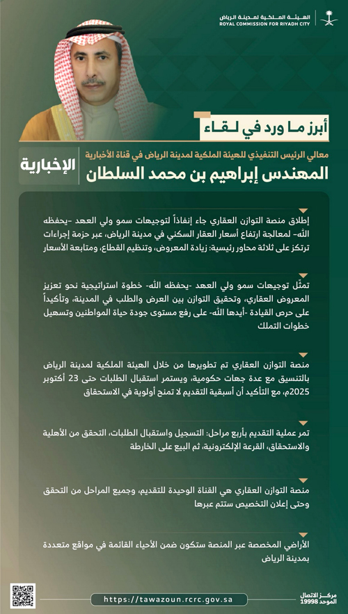 أطلقت الهيئة الملكية لمدينة الرياض الخميس منصّة «التوازن العقاري» المخصّصة لاستقبال طلبات المواطنين الراغبين في الحصول على أراض سكنية في مدينة الرياض، وذلك من خلال المنصة https://tawazoun.rcrc.gov.sa/، حيث سيستمر استقبال الطلبات حتى نهاية يوم الخميس 23 أكتوبر 2025م.