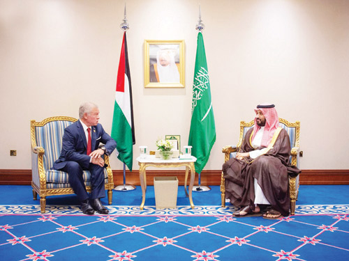 كما التقى صاحب السمو الملكي الأمير محمد بن سلمان بن عبدالعزيز آل سعود ولي العهد رئيس مجلس الوزراء، في العاصمة القطرية الدوحة على هامش أعمال القمة العربية الإسلامية الطارئة، جلالة الملك عبدالله الثاني ابن الحسين ملك المملكة الأردنية الهاشمية.
